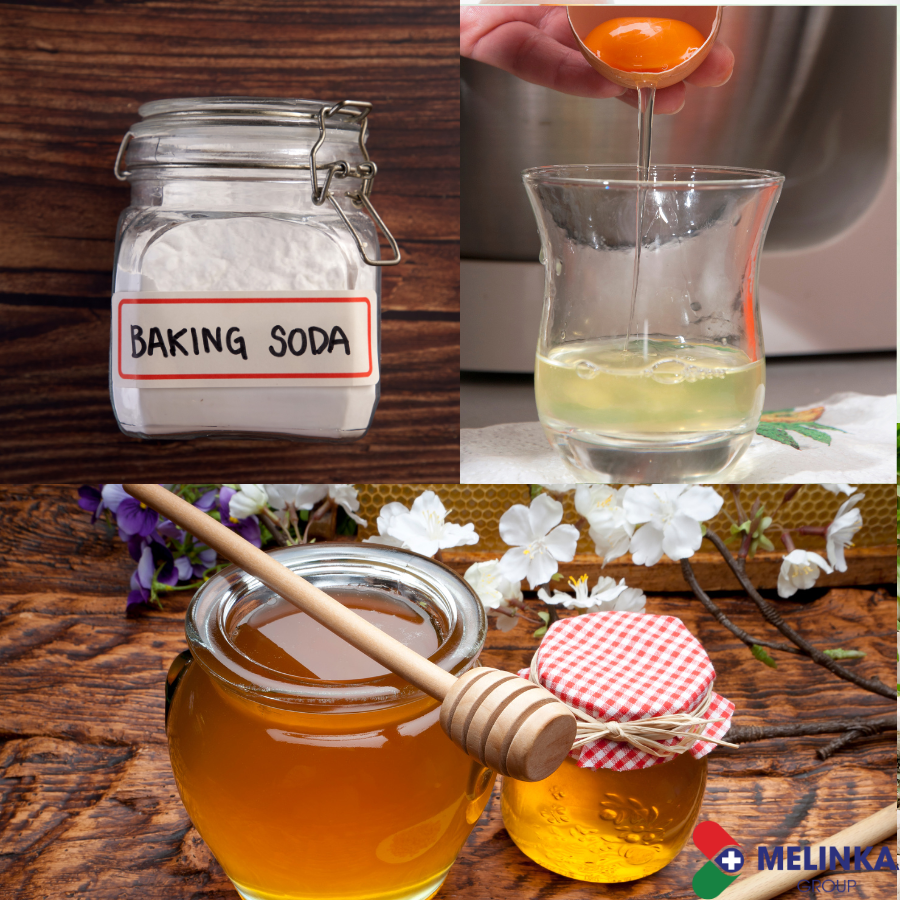 + 1/2 muỗng Baking soda + 2 lòng trắng trứng gà +1/3 thìa mật ong