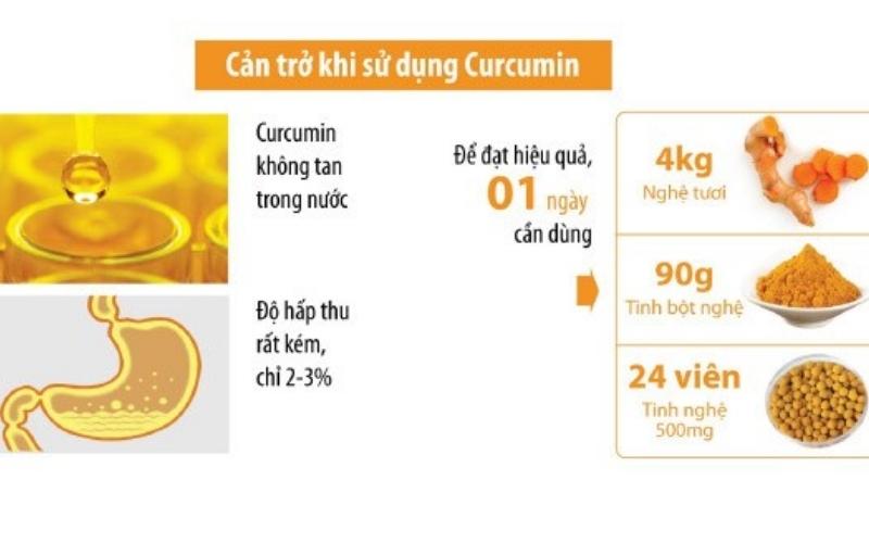 Khi hòa tan curcumin vào trong dầu nóng hoặc nước nóng có thể làm giảm sinh khả dụng của curcumin, dẫn đến giảm tác dụng của hoạt chất. Nhưng curcumin lại có khả năng hấp thu tốt hơn khi dùng cùng thức ăn chứa dầu mỡ.