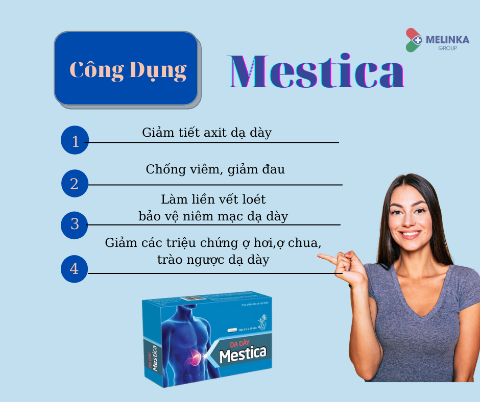 Dạ dày Mestica là viên uống thảo dược lành tính, giúp làm giảm các triệu chứng viêm loét dạ dày hiệu quả là nhờ vào công dụng của các thành phần: