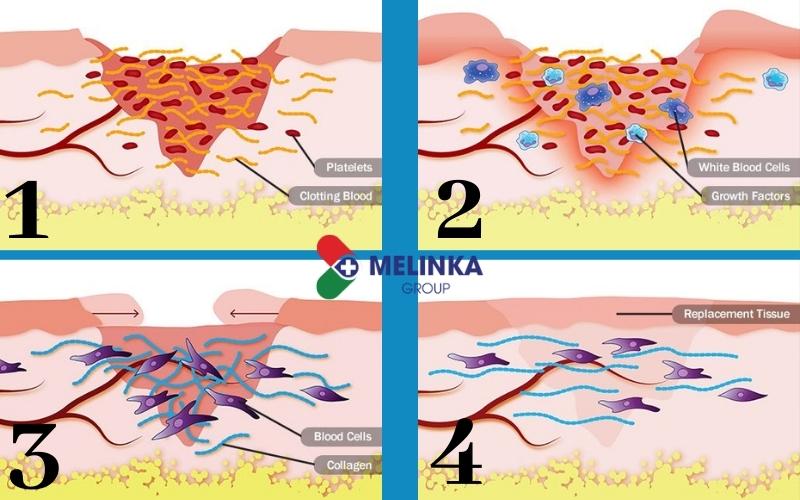 Quá trình lành vết thương cơ bản gồm 4 giai đoạn diễn ra liên tiếp.