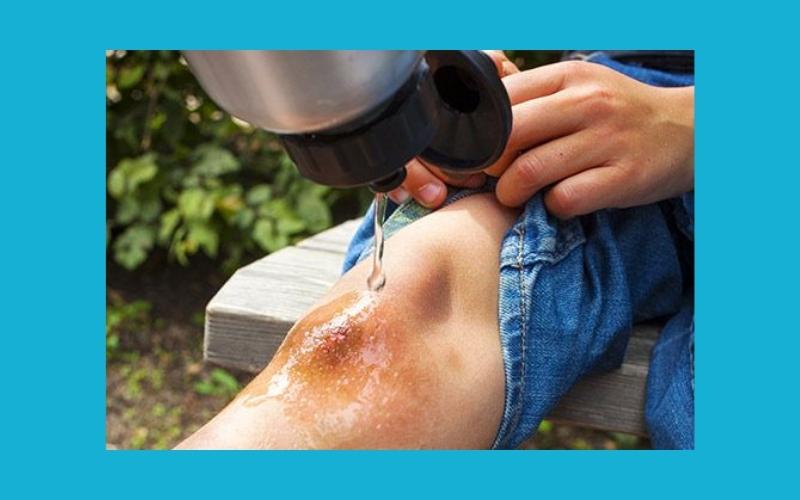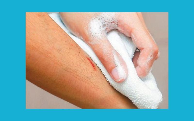 Cho một chút xà phòng vào khăn và rửa xung quanh vị trí bị thương. Chú ý không được để xà phòng dính vào vết thương. Không sử dụng hydrogen peroxide hoặc i-ốt. Bởi nó có thể gây kích ứng da tổn thương.