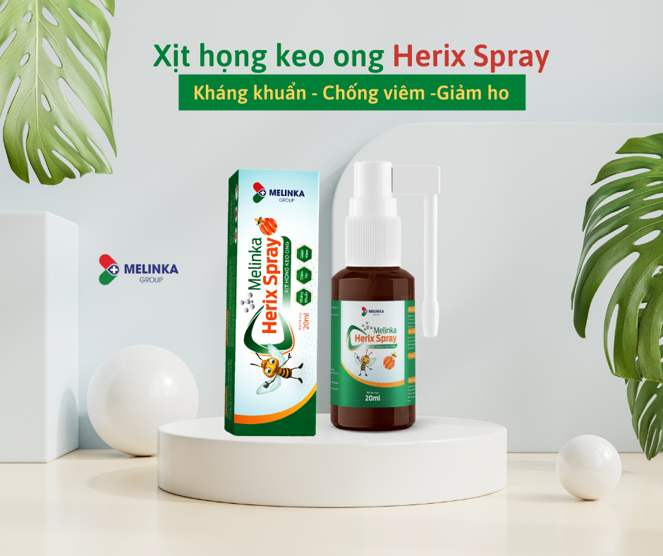 Melinka mách các bạn có thể sử dụng Xịt họng keo ong Herix Spray để chăm sóc đường hô hấp cho trẻ. Herix Spray chiết xuất hoàn toàn 100% từ thảo dược thiên nhiên, có chứa keo ong được mệnh danh là hoạt chất kháng sinh tự nhiên giúp kháng khuẩn, giảm ho và tăng cường hệ thống miễn dịch cho trẻ. Không những thế sản phẩm còn chứa những thảo dược tốt cho hệ hô hấp được ông cha ta sử dụng từ lâu đời như húng chanh, bạc hà,...Không những thế để phù hợp với hương vị của trẻ, Melinka đã thêm mật ong vào để tạo vị ngọt.