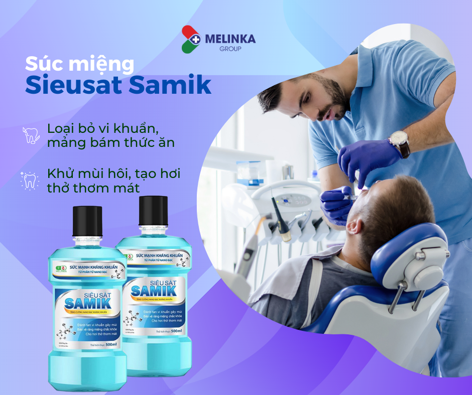 Nước súc miệng có tác dụng kháng khuẩn, khử mùi hôi và ngăn ngừa nguy cơ mắc các bệnh lý về răng miệng như viêm lợi, viêm kẽ chân răng,...Chính vì vậy, bạn nên sử dụng nước súc miệng thường xuyên để bảo vệ răng miệng của mình. Hiện nay trên thị trường có rất nhiều loại nước súc miệng khác nhau, nhưng trong đó không thể không kể đến khả năng kháng khuẩn và loại bỏ các mảng bám trong răng miệng của NƯỚC SÚC MIỆNG SIEUSAT SAMIK. Samik đem lại công dụng kháng khuẩn hiệu quả là nhờ vào các hạt phân tử nano bạc với kích thước nhỏ cỡ nm giúp tiêu diệt vi khuẩn mạnh hơn lên gấp 200 lần so với kim loại bạc thông thường. Chính vì vậy mà Dung dịch súc miệng Sieusat Samik mang lại hiệu quả vượt trội trong việc làm sạch và khử mùi hôi răng miệng, phòng ngừa và hỗ trợ điều trị các bệnh răng miệng và đường hô hấp như viêm lợi, viêm họng, viêm amidan.