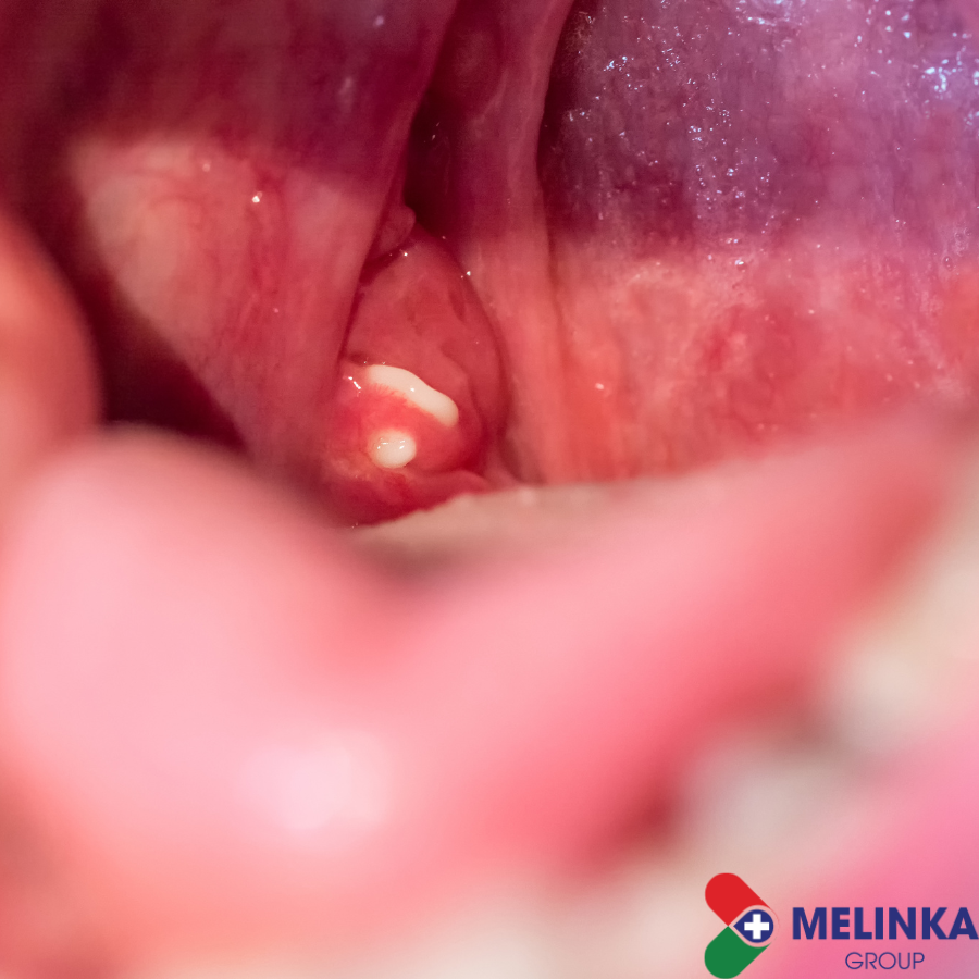 – Khám họng thấy có mủ trắng bẩn ở khe, hốc amiđan hai bên. Sờ thấy hạch dưới hàm cả hai bên, di động, ấn đau.